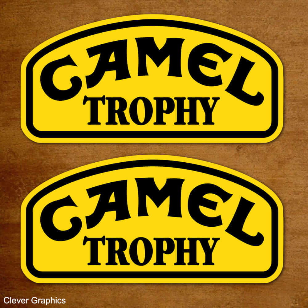 Pair of Camel Trophy – Black Stickers. This pair of vibrant yellow and black stickers features the words “Camel Trophy” prominently displayed. Perfect for motorsport enthusiasts, these stickers are available in various sizes to suit your preference. Enhance the look of your vehicle or any other surface with these eye-catching and high-quality stickers that proudly showcase your love for the Camel brand.